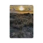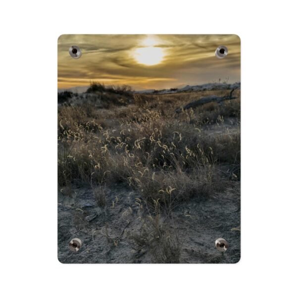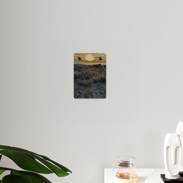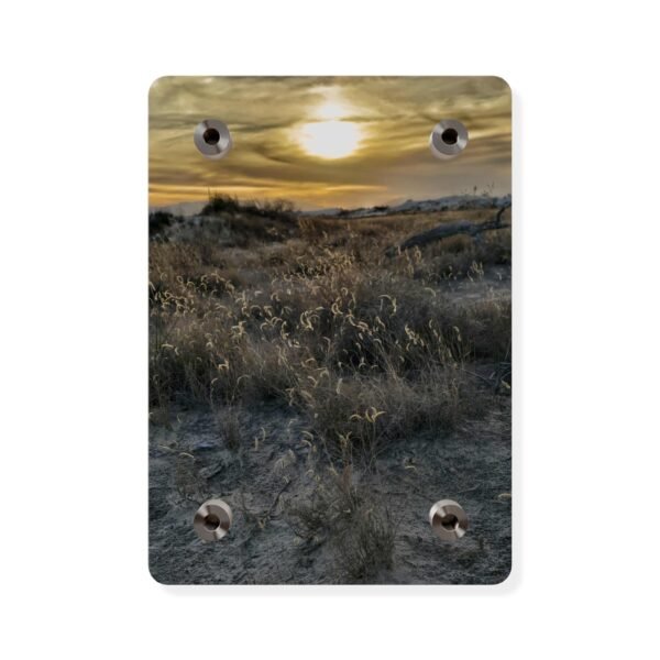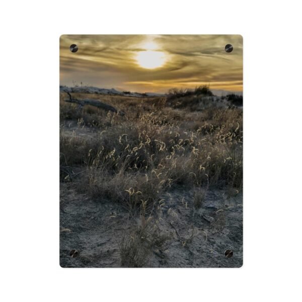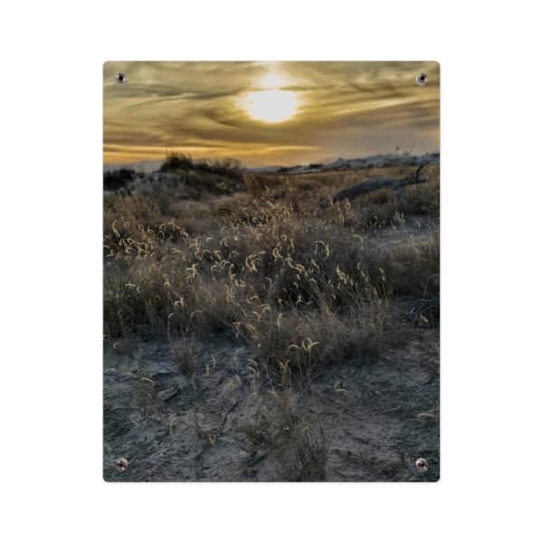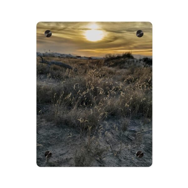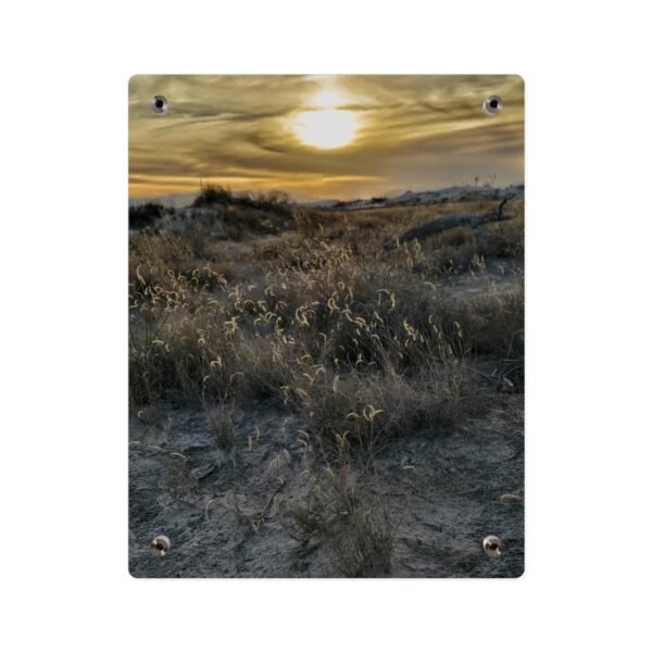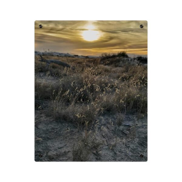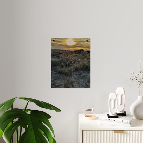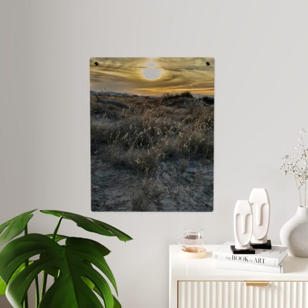 Bring the hush of a windswept dune inside with a clear acrylic wall panel that feels like a window to a late-summer sunset. The translucent acrylic and glossy finish let light play across the scene, deepening the golden grasses and the low, warm sun. Brushed silver stand-offs float the image slightly off the wall, creating depth and a contemporary gallery look. Choose from multiple sizes and orientations to fit a hallway, entry, or cozy reading corner — it settles into calm spaces and quiet routines, inviting slow moments and memory recall.