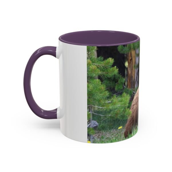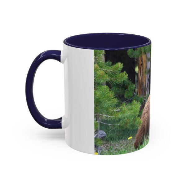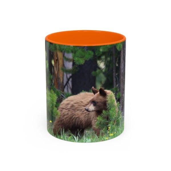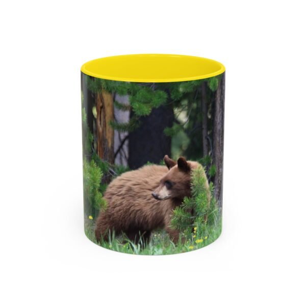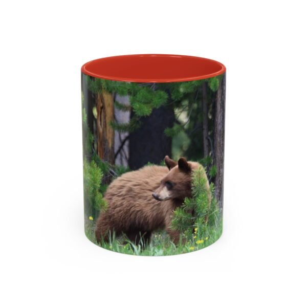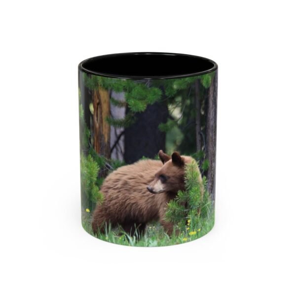Sip morning coffee while remembering quiet forest mornings. This ceramic accent mug pairs a glossy black interior and handle with a wrapped wildlife photograph, letting a cinnamon-colored bear nestle among pines and meadow grass. The image carries rich, true-to-life colors that pop against the dark contrast, bringing a little wilderness calm to your kitchen, office, or cabin countertop. Solid and safe for everyday use, it stands up to microwave and dishwasher routines and arrives with a bright, durable print that keeps the scene vivid cup after cup.