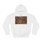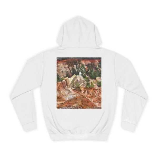This hoodie carries the quiet awe of a canyon hike back to everyday life. The soft, slightly heavy fabric and loose fit make it feel like a warm pause between errands or an impromptu roadside stop to take a photo. The front- and back-panel artwork—earthy reds, ochres, and scattered pines—reads like a watercolor memory of layered cliffs and wind-sculpted spires. Wear it with jeans, boots, or a beanie when you want your outfit to echo a traveled landscape. The roomy kangaroo pocket keeps hands warm and practical items close, while the adjustable hood and durable side seams mean this piece will keep its shape through seasons of use. Certifications from WRAP, Sedex, and PETA speak to responsible production and ethical standards, so the hoodie feels as good to wear as the scene feels to remember.