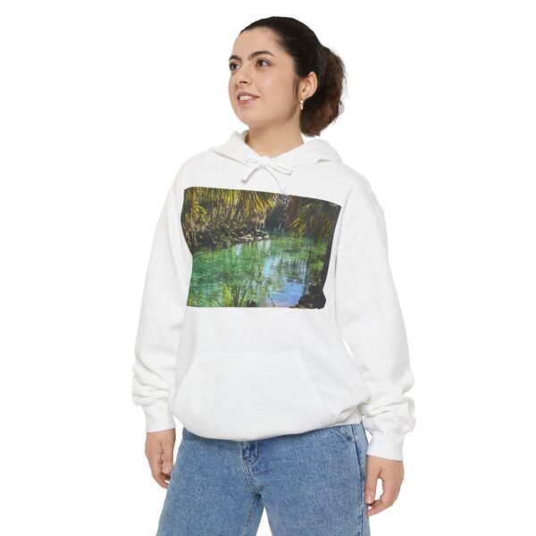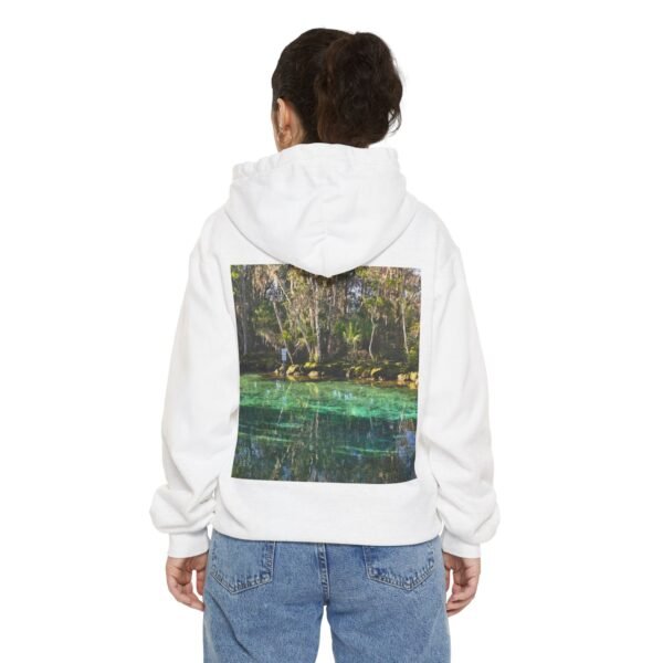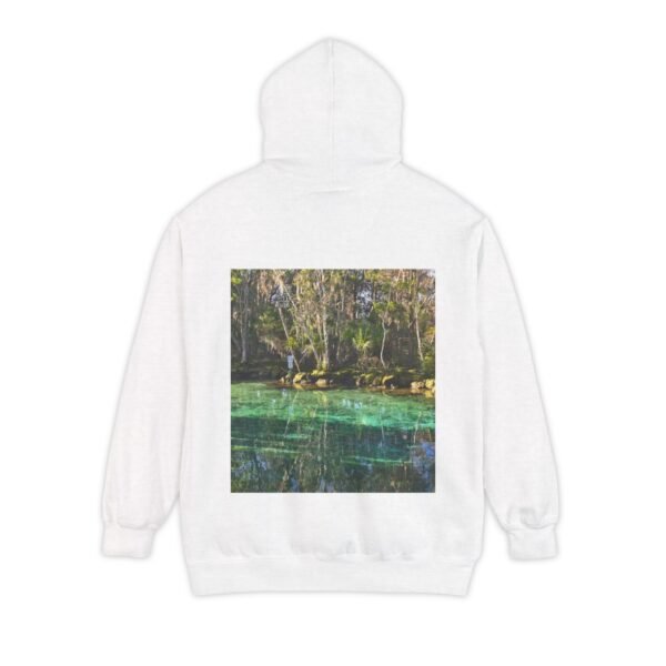 This relaxed hoodie brings the hush of a forest stream into everyday wear. The front and back both carry a photographic window of a clear, emerald spring—light dappling through trees, water so transparent you can see the pebbles below. It feels like pulling on a quiet morning: warm, substantial, and instantly grounding. The heavy, ringspun cotton blend holds the print with clarity while the lined hood and drawcord add extra shelter on blustery walks. Wear it to slow down, to layer over a tee on a lakeside errand, or to curl up with a book and a mug while rain drums on the roof.