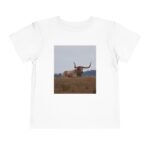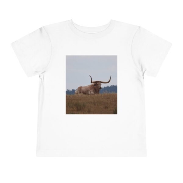 This lightweight toddler tee brings a quiet slice of wide-open country into everyday play. A soft white shirt features a muted photo of a longhorn resting in a grassy field — warm tans and dusty blues that feel like late-afternoon light. It lays flat and breathable against young skin, so little explorers can climb, crawl, or lounge with comfort. The image adds a gentle, rustic mood that suits backyard adventures, family farm visits, or storytime about animals and open spaces.