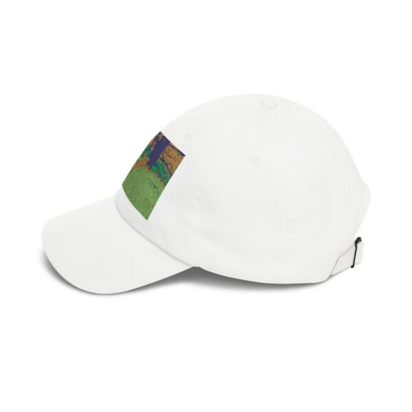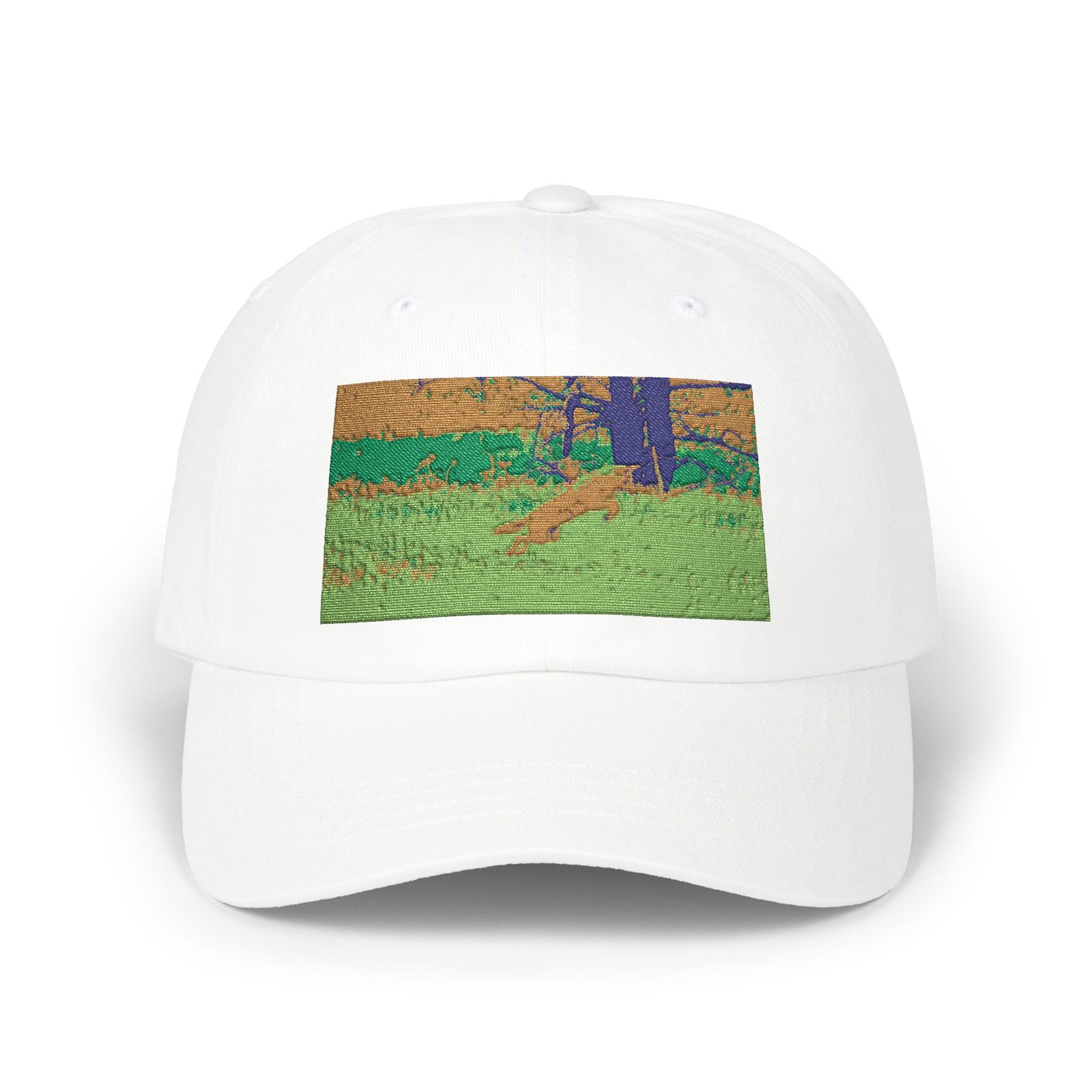 A relaxed, artful cap that feels like a quiet walk through a sunlit meadow. The low-profile, unstructured silhouette sits gently on the head while the pre-curved Permacurv® visor keeps morning glare out of your eyes. Embroidered front artwork hints at a small, impressionistic landscape—warm golds, cool greens, and a touch of indigo—so the hat reads like a wearable snapshot of an afternoon outdoors. The hideaway adjustable strap with antique brass buckle lets you tune the fit without breaking the cap’s clean lines. Lightweight cotton (or cotton-blend for camo) and a sewn-in label keep the inside simple and comfortable. Wear it with worn denim, a faded tee, or a light jacket for errands, hikes, park picnics, or lazy weekend wanderings—whenever you want a low-key piece that carries a bit of quiet color and calm.