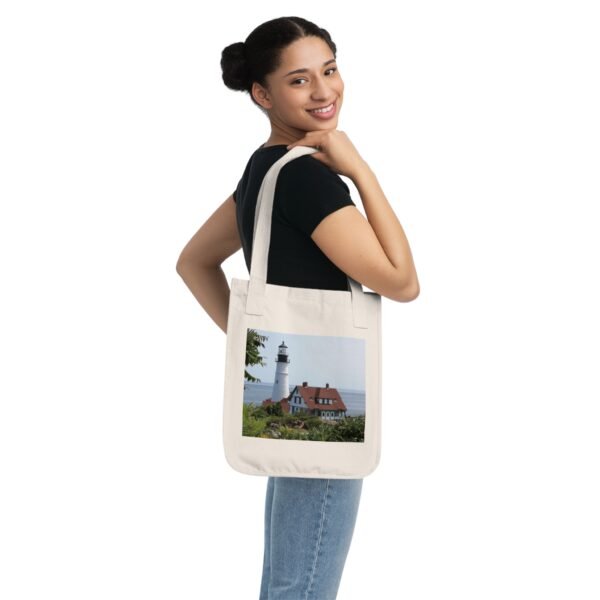 A sturdy organic canvas tote printed with a coastal lighthouse scene — warm roofs, white tower, and a calm stretch of sea. The medium-weight, natural cotton has subtle flecks that give the bag an honest, lived-in look. Long, reinforced cotton web handles sit comfortably on the shoulder, and the single roomy compartment swallows groceries, beach towels, or a stack of books. Lightweight enough to carry all day, durable enough for repeat seaside errands or market runs, this tote feels like a quiet nod to mornings by the harbor.